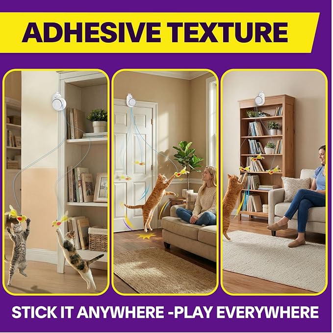 - Clip, Stick, or Handheld for Flexible Play - This setup works as clip-on cat toys or a cat toys for indoor cats solution that also supports handheld use. The versatile cat toy design fits door frames, glass, tile, and wood surfaces, making it easy to introduce interactive cat toy movement to daily play spaces. Ideal for homes and apartments where kitten toys and vertical layouts help save floor area.