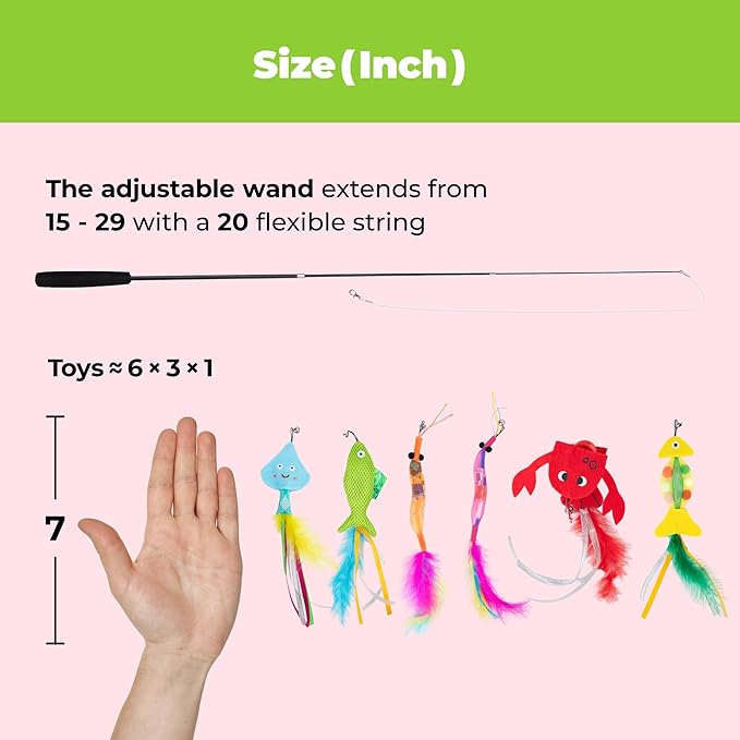 - 6-in-1 interactive cat wand toy set. One flexible wand with six interchangeable attachments in fun fish and sea characters. Each teaser toy has feathers, ribbons or crinkle elements so bored indoor cats stay interested. Swap attachments in seconds with the clip hook